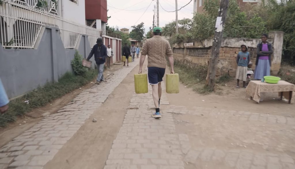 Pour sa première immersion, Charles a testé le métier de « mpaka rano » (porteur d’eau) à Ampitatafika. Il a d’abord livré deux bidons de 20 litres chacun à domicile, un effort déjà considérable. Mais quand il a fallu tirer une charrette avec une vingtaine de bidons sur une pente glissante, l’aventure a pris une autre dimension.